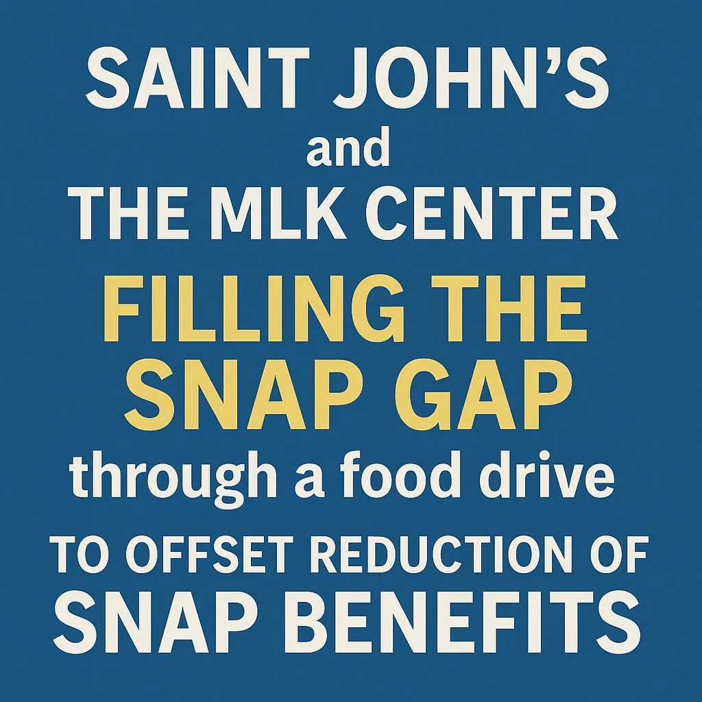 Saint John’s is launching an emergency food drive: “Filling the SNAP Gap.” Together, we can strengthen the MLK Center so they can strengthen our community—one meal, one family, one act of love at a time. “For I was hungry and you gave me food.” — Matthew 25:35 Feeding people isn’t an extra project; it’s the Gospel in action. This is about being true to our baptismal covenant in “respecting the dignity of every human being.” It’s not about determining who is employed, unemployed, deserving, or undeserving. It’s about being Christians who are trying our best to mirror our Savior, Jesus Christ. “Love your neighbor as yourself.”